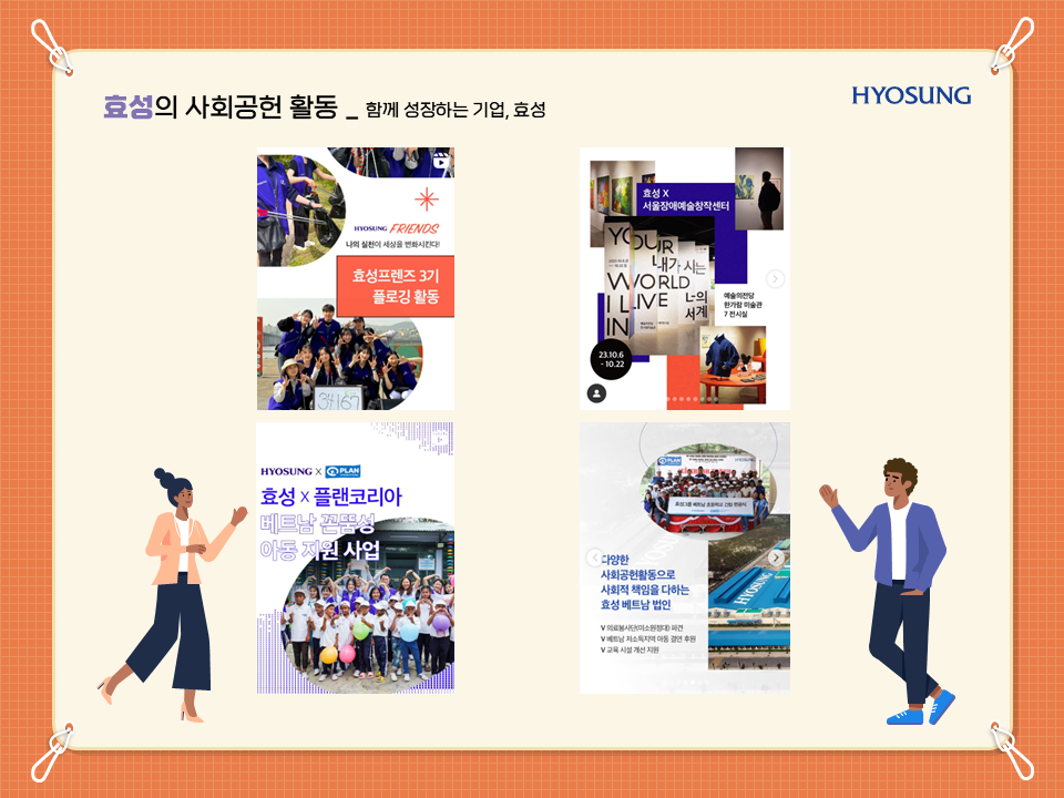 기업의 성공은 단순히 수익을 내는 것에 그치지 않습니다. 사회와 환경에 기여하며 지속 가능한 성장을 이루는 것이야말로 진정한 ESG 경영의 핵심입니다. 효성은 친환경 기술 개발뿐만 아니라, 다양한 사회공헌 활동을 통해 지속 가능한 미래를 만들어가고 있습니다.