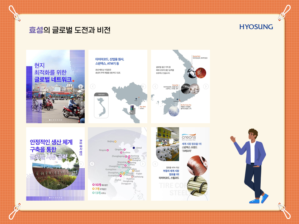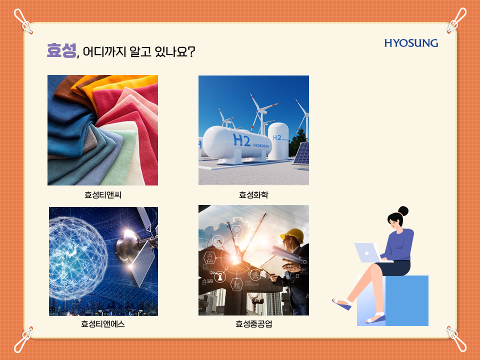 효성티앤씨(섬유/무역), 효성중공업(중공업, 건설), 효성화학, 효성 TNS(정보통신) 등 다양한 영역에서 한국을 빛내고 있답니다.